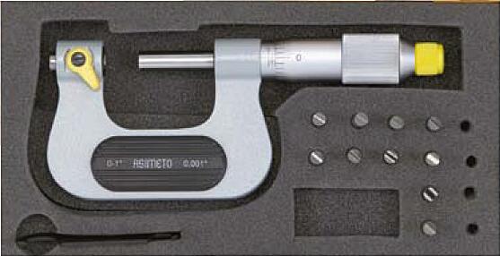 Analóg mikrométer rögzített, nem forgó orsóval, surlódó dobbal és acél lakkozott kerettel öt pár érintővel különböző menetek mérésére (a felső szög 60°, különböző emelkedés). Alaptartozékok: S kulcs, 5 pár érintő, jótállási jegy, használati útmutató, kalibráló tanúsítvány, műanyag tok.