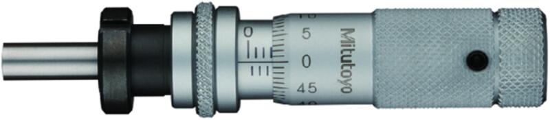Kicsi, standard, nullázható, nem digitális Mitutoyo mikrométer sík M9.5 mm rögzítő anyával és lapos orsócsúcs és koncentrikus orsózár.