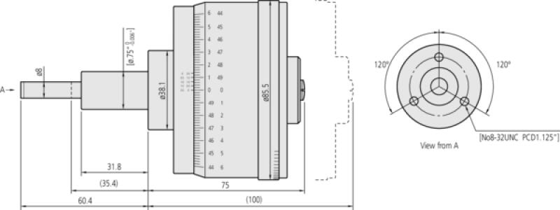 Nagy felbontású, kétirányú, nem digitális Mitutoyo mikrométer nagy dobbal,  sík Ø709" szárral és nagy teherbírású Ø8 mm nem forgó orsóval, ami lapos,  keményfém csúccsal van szerelve.
