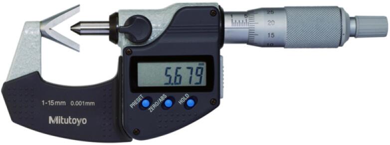 Külső Digimatic mikrométer V-ülékkel vágószerszámok mérésére. Előnyös tulajdonságai: Vágószerszámok külső átmérőjének mérésére. 3-élű csapok, fúrók, dörzsárak precíz méréséhez.