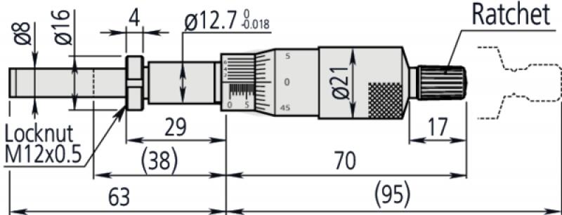 Közepes méretű, standard, nagy felbontású, nem digitális Mitutoyo mikrométer sima, Ø. 5" szárral, nagy teherbírású 8 mm orsóval és lapos, keményfém csúccsal. Racsnis zár.