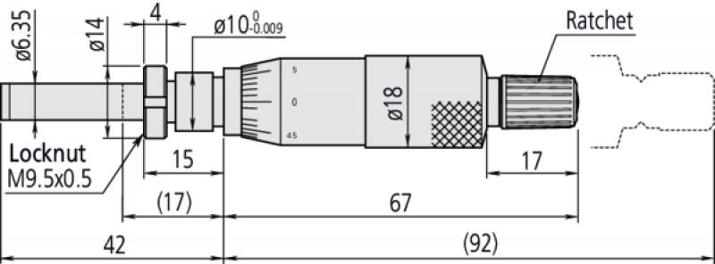 Közepes méretű, standard, nem digitális Mitutoyo mikrométer M9.5 rögzítő anyás szárral és lapos, keményfém orsócsúccsal.