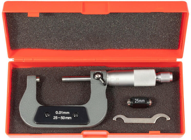 Analóg mikrométer 25-50 mm mérési tartományban és 0,01 mm mérési pontossággal.